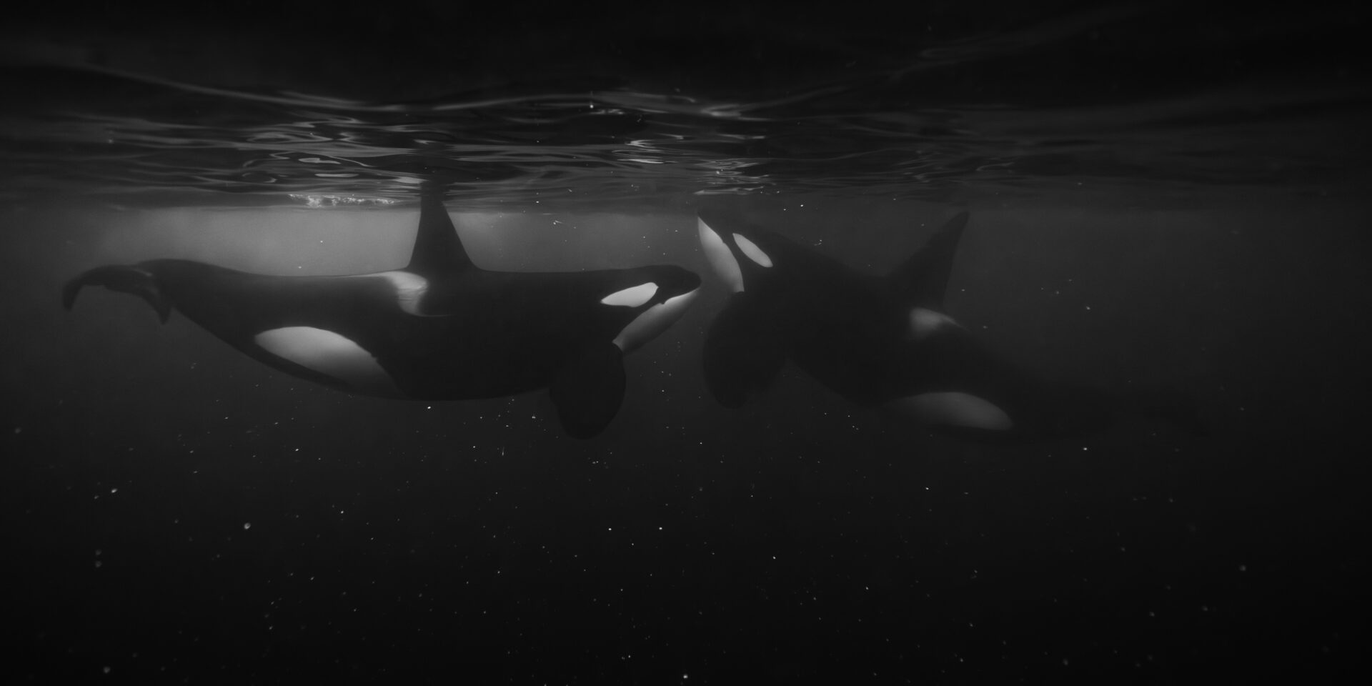 "For a medium meant to evoke feeling, there are times when you can’t escape the reality: you're playing a numbers game. In these icy waters, there’s no studio. No controlled lighting. No models. No bait. Just a pair of freedive fins. A wetsuit that feels like it’s choking you. A camera encased in a cumbersome housing. And a prayer. Over nine days in Norway, five were spent cruising the northern coastline. Each day, you spend four to six hours in a small Zodiac, searching. On a good day, you get about 45 minutes in the water—when the animals feel comfortable enough to allow your presence. Of those, only five to ten minutes bring you close enough to photograph the whales. In total, maybe a minute or two across the entire week offers a real chance to capture an image that holds up. You need your settings dialed, your awareness sharp, and a fair bit of luck. Five or six photographs—if everything aligns—worthy of a place on paper. On the third morning, we found a pod beginning to hunt deep in one of the fjords. Amidst the frenzy—orcas circling the fish, bits of herring sparkling below, colossal humpbacks and fin whales surging from the deep—it's hard to know where to point your camera. Out of the corner of my eye, I caught a glimpse of two bull orcas maintaining the shape of the bait ball. I turned, locked focus, and managed a few images. A half second earlier they were too far apart. A moment later, overlapping. But this frame was just right. A coordinated dance of two apex predators. Not their last, but likely the last many of those herring would witness. Despite the rush and awe of being in the water with the orcas, it still comes down to chance. The house should always win. But you dive in anyway. Trusting even in this cold, dark world below, you can shape the chaos into something that resonates."
